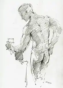 In the mid 1980s he also added hyper realistic aquarelles of still lifes and landscapes to his portfolio. For the latter he claims John Singer Sargent as model. By the late 1990s he moved to painting humans, mostly the male body. His style became impressionistic and lighter,[1] comparable to the later works of Joaquín Sorolla. His male nudes have been described as ″body cult″ and ″erotic″ works[2] by the Süddeutsche Zeitung.