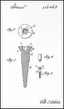 A Robertson screw, also known as a square screw[1] or Scrulox,[2] is a type of screw with a square-shaped socket in the screw head and a corresponding square protrusion on the tool. Both the tool and socket have a slight taper. Originally designed to enable the screws to be made using cold forming of the heads,[3]: 79–81 the taper has two other advantages which have helped popularize it: it makes inserting the tool easier, and helps keep the screw on the tool without the user having to hold it there.[3] The Robertson screw is specified as ANSI Type III Square Center.