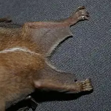Additionally, the flying squirrel possesses thick rope-like muscle structures on the edges of its membrane to maintain the shape of the membranes.[15] These muscular structures called platysma, tibiocarpalis, and semitendinosus, are located on the propatagium, plagiopatagium and uropatagium respectively.[15] These thick muscle structures serve to guard against unnecessary fluttering due to strong wind pressures during gliding hence minimizing energy loss.[15]