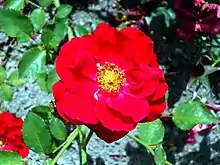 'Alain' is a bushy, upright hybrid tea rose, 3 to 5 ft (0.91–1.52 m)in height, with a 2 to 3 ft (0.61–0.91 m) spread. Bloom size is 4 in (100 mm). It has a semi-double (17-25 petals) bloom form.. The flowers are bright red and open relatively flat, which exposes the bright yellow stamens to view. Blooms occur in open clusters, up to as many as nine, and bloom repeatedly throughout the season.[1]