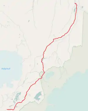 With its 200 km, it is the longest of the Icelandic highland roads. Its southern end is at the lake Þórisvatn, to the northeast of the volcano Hekla, and its northern end is the south part of Bárðardalur valley, to the southwest of lake Mývatn.