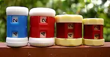 The luxury version of the Compact was presented in a gift box, it was priced at a guinea and became a contemporary collector's item, tending to be little-used due to impracticality. The assemblage included a thin and delicate 6-inch – later 8-inch – tape measure in place of the grip band.[lower-alpha 5] On this luxury version the tape-measure assembly caused the centre of the gadget to rotate independently, making it difficult for adult fingers to grip the remaining part of the stable outer skin to turn the main assemblage for use as a row counter.[1] Some of the counters in this range featured pearlised plastic outer skins in various pastel colours.[lower-alpha 6]