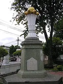 This monument is shaped like a prang mounted on a four-sided pedestal of grey and white marble.