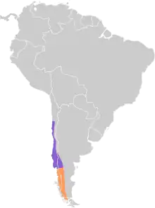 The rufous-tailed plantcutter is found further south than any other cotinga, inhabiting scrub, forest edge and river valleys in Chile and western Argentina. The range extends from Magallanes region north to Atacama in Chile and from Santa Cruz north to Mendoza in Argentina. Birds breeding in southern or high-altitude regions move northwards or towards the lowlands in winter. It has been recorded as a vagrant to the Falkland Islands. Birds are often seen in gardens, farmland and orchards and are sometimes considered to be a pest. The nest is a cup of root fibres and twigs built in a fork in a shrub or tree. Two to four eggs are laid, they are blue-green with dark spots concentrated at the larger end.