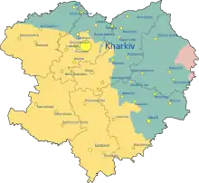 The Russian occupation of Kharkiv Oblast, officially the Kharkov Military–Civilian Administration,[lower-alpha 2] is an ongoing military occupation that began on 24 February 2022, after Russian forces invaded Ukraine and began capturing and occupying parts of Kharkiv Oblast, Ukraine. Russian forces failed to capture the capital city of the oblast, Kharkiv. However, other major cities including Izium, Kupiansk, and Balakliia were captured by Russian forces. The city of Chuhuiv was captured by Russian forces on 25 February, but was recaptured by Ukrainian forces on 7 March. As of November 2022, Russian forces only occupy a small portion of land in the Kharkiv Oblast.