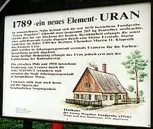 Johanngeorgenstadt is situated in the westernmost part of the Ore Mountains directly on the border to the Czech Republic and on the boundary between the Vogtland and Ore Mountains. It is famous because in 1789, the chemist M.H. Klaproth discovered the element uranium in a sample from the town's Georg Wagsforth silver mine. About 160 years later, the town became Wismut's Object 01 and the old town center was completely destroyed because of intense near-surface underground mining for uranium. Of the old town center, only the church survived this part of town history while all other houses had to be removed because of severe damage. Mining took place from 1946 to 1958 and about 3,500 tonnes of uranium were extracted. The deposit extended over the border into Czechoslovakia. While the Czechoslovakian uranium company carried out own exploration and mining on its site of the deposit, one vein was mined by Wismut under Czech territory under contract between the East German and Czechoslovak governments.