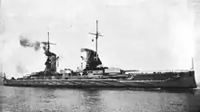 The ship was armed with a main battery of ten 30.5 cm SK L/50 guns in five twin turrets.[1][lower-alpha 3] She disposed with the inefficient hexagonal turret arrangement of previous German battleships; instead, three of the five turrets were mounted on the centerline, with two of them arranged in a superfiring pair aft. The other two turrets were placed en echelon amidships, such that both could fire on the broadside.[3] The ship was also armed with a secondary battery of fourteen 15 cm (5.9 in) SK L/45 guns in casemates amidships. For close-range defense against torpedo boats, she carried eight 8.8 cm (3.5 in) SK L/45 guns in casemates. The ship was also armed with four 8.8 cm L/45 anti-aircraft guns. Her armament was rounded out by five 50 cm (19.7 in) torpedo tubes, all mounted in the ship's hull; one was in the bow, and the other four were on the broadside.[1]