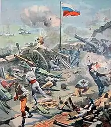 Vineta and Panther in the distance, shelling Fort San Carlos in January 1902