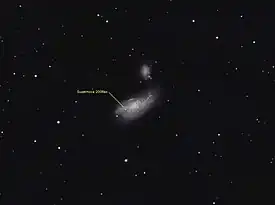 SN 2008ax was a helium-rich type Ib core-collapse supernova in the interacting galaxy NGC 4490.[3] It was independently discovered on 3 March 2008 by LOSS[5] and 4 March by Koichi Itagaki.[6] The site had been monitored six hours before discovery, thus constraining the time of the explosion breakout.[3] It was the third-brightest supernova of 2008.[7] The brightness in the B-band peaked about 20 days after the explosion.[3] X-ray emissions were detected from the event, which are most likely the result of shock heating from the supernova ejecta and circumstellar material.[8]