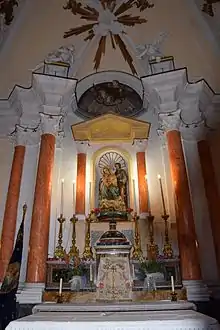 The church has a single navy with three altars: the high altar (in white marble and adorned by red stucco columns) and two side altars, in polychromatic marble, realized and inaugurated in 1937.