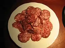 Salchichón is a Spanish summer sausage that is made by smoking, drying, cooking, or some combination.[1] It is made with pork, although some recipes use other meats including ox, veal, or horse.[1]