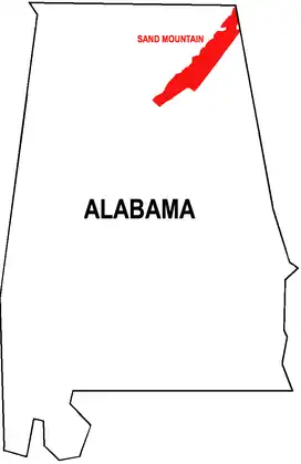 Sand Mountain is a sandstone plateau in northeastern Alabama and (to a far lesser extent) northwestern Georgia and southeastern Tennessee where the plateau is known as Raccoon Mountain and Elder Mountain. It is part of the southern tip of the Appalachian mountain chain and it is the largest plateau in the chain. Geologically a continuation of Walden Ridge, Sand Mountain is part of the Cumberland Plateau, separated from the main portion of the plateau by the Tennessee River and Sequatchie Valley. The average elevation on Sand Mountain is around 1,500 feet (460 m) above sea level, compared to about 650 feet (200 m) in the surrounding area.[1] This elevation leads to its having the coolest climate in the state of Alabama.[2] The largest city on Sand Mountain is Albertville, in Marshall County. As of the 2020 census, the population of the city was 22,386.[3]