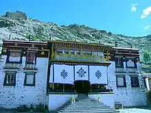 Sanga Monastery is located in the center of the old city of Dagzê.[1] The temple grounds cover about 15 acres (6.1 ha), and the building covers 2,343 square metres (25,220 sq ft). The Lhasa River can be seen from the rear of the monastery.[2] Diagonally above the monastery on the hillside are the ruins of a hilltop fort. This is the ruin of Dagtse Dzong, or Dechen Dzong. Dzong means "fort".[3]