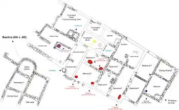 - ↑ assestion made due to the most recent pottery recovered from the site, dating from the late 5th and 6th centuries AD (such as several types of ARS D 80b, 87, 93, 94, 97, 99b, 104, 105 and 106)