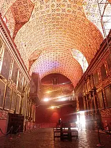 Together with the choir and main arch, it represents the most splendid focus of the church. Built around the middle of the 17th century, it consists of three bodies and five streets, carved and gilded entirely in gold leaf, paid for entirely by Doña María Arias de Ugarte, according to historical documents it cost her the value of 4,200 pesos of a 8 shields. The niches exhibit figures carved in wood, several with costumes made of glued fabric and richly decorated with the techniques of stew and sgraffito.