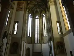 The triumphal arch of the apse has two frescoes with the Crucifixion; the apse has remains of majolica-covered pavement from a Neapolitan workshop of the Angevin era (late 14th-early 15th century). Also present is a Martyrdom of St. Ursula attributed to Francesco da Tolentino (1520).