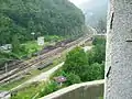 The line was opened in 1891 in the Bosnian gauge of 760mm. With the construction of the railway, the port of Metković grew into one of the most important ports in Dalmatia, and the first port in Dalmatia to receive a railway line.[11] The section from Mostar to Konjic was built through the canyon of the Neretva river, and in some places, it had features of a mountain railway. A lot of walls, tunnels and cuttings were built, and because of the frequent crossing from one side of the river to the other, there were also a lot of bridges, so that section was much more expensive than the section built before. From Konjic to Sarajevo, the builders had to overcome the ascent of the Ivan Mountains with a relative height of 600 metres (2,000 ft). For this purpose, a third rail (the so-called cogwheel of engineer Roman Abt) was laid on two sections: Pazarić - Tarčin (3,722 km, incline 35 per thousand) and Podorašac - Raštelica (15,222 km, gradient 60 per thousand).[12] With the construction of the railway, the port in Metković has grown into one of the most important ports in Dalmatia, and the first port in Dalmatia to receive a railway.[13] A tunnel with a length of 648 m was also cut through the Ivan mountains. Special steam locomotives of the 97 series performed the pulling of trains on these two sections.[10]
