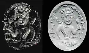 The figure in the seal wears what is called a "tulip headdress", a type of headdress well known in Bactria from the time of the Kidarites (4th century CE), to the time of the Turks (6th century) and beyond.[11]