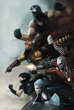 In a new storyline starting with issue #10 titled "Depths", the Six have been hired by a new villain named Mr. Smyth, a slave trader.[13] He is building what he hopes will be the world's biggest and only prison. He is also holding the Amazon Artemis of Bana-Mighdall prisoner. Jeannette breaks her out and was met with opposition from the rest of the team, who in the middle of battling with each other are interrupted by Wonder Woman.[14] The Six one-by-one turn on Smyth and free all the slaves he possessed on his Devil's Island, ending with Deadshot killing Smyth in cold blood. Disappointed in the repetitive failed progress the team's missions have had since joining, Bane decides to take over as team leader with the approval of half the team. His first directive was to remove Scandal Savage as a team member and replace her with Black Alice. After Catman flees to find the murderers of his son, he is followed by Rag Doll, Alice, Deadshot, and Scandal. Bane and Jeanette replace them with King Shark, Dwarfstar, Lady Vic, and Giganta.