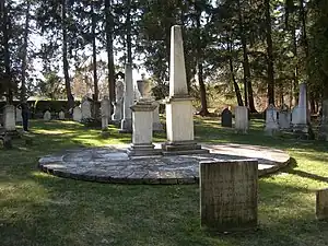 The burial sites are arranged around the graves of Theodore Sedgwick (1746–1813), patriarch of the prominent Sedgwick family of New England and a justice of the Massachusetts Supreme Judicial Court (among other positions), and his wife, Pamela Dwight Sedgwick (1753–1807). The graves of the others, who include in-laws, servants, and family pets, form concentric circles around the center, with the buried grouped by familial affiliation, and laid to rest with their feet toward the center. This contrasts with the orientation of the other graves in the cemetery, which (in classic fashion) face east, toward the rising sun, Jerusalem (with all its significance), and the hoped-for Resurrection. It has been said that this arrangement of the graves sees to it that on Judgment Day, when the Sedgwicks rise to face their judge, they will only have to look at other Sedgwicks.[1]