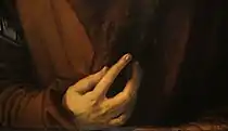 Dürer is depicted in front of an open window before a flat landscape containing a lake and distant snow-capped mountains. The landscape may represent either the memory of his recent travels abroad or his inner mental state.[4] Light spills from the window, falling along his head to highlight both his delicate skin tones and long blond hair.[1] Dürer is dressed with effeminate grace in flamboyant, extravagant clothes showing the influence of Italian fashion. His low-necked shirt or chemise is of fine linen, gathered and trimmed with a band of gold braid or embroidery, and worn under an open-fronted doublet and a cloak tied over one shoulder. His white jacket has black lining under a white pleated shirt of which the verticals match the horizontals of his headdress. His fingers are crossed, hidden inside silk gloves, an unusual pose for Dürer's early career; he always paid close attention in detailing the hands of his sitters who are usually showing holding an object; examples include a pillow, rosary, sheet of paper and flower.[5]