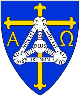 - Gules, an orle and pall Argent, conjoined and surmounted of four plates, occupying the dexter and sinister chief and the base and fess points respectively; the first inscribed "Pater", the second "Filius", and the third "Spiritus Sanctus", the centre "Deus"; the connecting portions of the orle between them having the words "non est", and those of the pall "est".