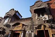The defining characteristic of a shikumen building is the prominent main gate - which also gives rise to the name "shikumen". Typically, this gate is located on the central axis of each dwelling, with twin doors made of heavy wood, painted glossy black. Typical width is around 1.4 metres, with a height of around 2.8 metres. The doors usually possess brass or iron knockers.[7] The original documented name for such buildings was "shigumen" (石箍門, Shanghainese: zaq⁸ ku¹ men⁶), which in Shanghainese Wu meant "gate framed with stone", but over time corrupted into the similar-sounding "shikumen".[4] Each individual dwelling displays typical characteristics of traditional Jiangnan architecture, while the layout of the development as a whole is adopted from Western terrace houses.