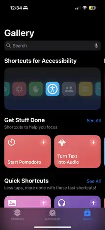 Opens the Gallery with Shortcuts that have been premade by Apple.