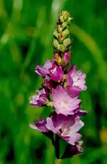 The inflorescence is a dense or open spikelike raceme of many flowers. Each flower has five pink petals up to 2 centimeters long, usually notched at the end, and a central tube of reproductive parts (see flower closeup image).[3]