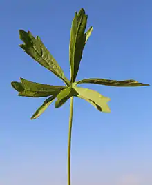 Sidalcea oregana is usually hairy in texture, the hairs thick and bristly toward the base of the stem. Most of the leaves are located low on the stem, basal or on long petioles.[2] Their blades are usually deeply divided into lobes (see image at left); upper leaves may be divided further into leaflets.