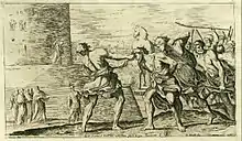 In Quintus of Smyrna, the Trojans, ready to attack the Greek camp, see smoke coming from the Greek camp and cautiously approach. When they arrive at the camp they find only Sinon alongside the Trojan Horse. The reader later finds out that it was Sinon who started the fire signal that drew the Trojans to the Greek camp.[7] The rest of the camp is deserted. The Trojans circle him and gently ask him questions but when he does not answer they grow angry and begin to threaten to stab him. When he still does not answer, the Trojans cut off his ears and nose. Finally he tells them that the Greeks have fled and they built the Trojan Horse to honor Athena. Sinon claims that Odysseus wanted to sacrifice him but he managed to escape and hide in a marsh. When they gave up looking for him and left he returned to the Trojan Horse. Sinon claims that the Greeks stopped looking for him out of respect for Zeus. All the Trojans believe this story, except Laocoön who, along with his two sons, is promptly attacked by a giant sea serpent. Following this, believing that Laocoön was attacked because he offended the gods, the rest of the Trojans begin to believe Sinon's story. Feeling bad for Sinon, and fearing wrath from the gods, the Trojans bring Sinon and the Trojan Horse into Troy.[8]