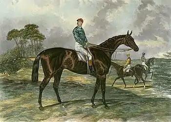 Sir Bevys made his 1879 debut on 28 May in the 100th[7] Derby at Epsom, where the large crowd included the Prince and Princess of Wales and other members of the Royal Family. The day was sunny and warm, but the ground was very soft after previous heavy rain.[8] He started at odds of 20/1 in a field of twenty-three, with Cadogan being made the 9/2 favourite. Ridden by George Fordham, Sir Bevys broke badly and was left many lengths behind the other runners, who were led in the early stages by Protectionaist and Caxtonian. Fordham made up the lost ground gradually and was just behind the leading group at the turn into the straight. In the last quarter mile Visconti went to the front and looked the likely winner, but Sir Bevys appeared "from goodness knows where"[1] to take the lead and then hold off the challenge of the 100/1 outsider Palmbearer to win by three-quarters of a length.[8] Despite the defeat of the more fancied runners, the result was a popular one, mainly on account of the winning jockey:[9] Fordham was a veteran who had returned from illness, alcoholism and near bankruptcy[2] to win his first Derby at the age of 41. The best contemporary explanation offered for the upset, apart from the generally low quality of the race, was that Sir Bevys was the only horse to cope successfully with the very heavy conditions.[1] A much later report credits Fordham with having identified a stretch of better ground on which to make his decisive move.[10] The winning time was the slowest for more than twenty years and remains the second slowest ever recorded.