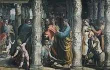 The incredible story of Peter healing the lame man, Acts 3:1–8 is a tapestry within Raphael's Cartoon collection. This miracle illustrates the "spiritual healing of Jesus." Pictured is the lame man sitting and leaning against an intricately detailed column with his arm reaching overhead for Peter to cradle his hand. Raphael's attention to detail is displayed in the lame man's face. The shadowing and tones used create the look of an aged, tired man. The wrinkles in his face and his eyes display the pain he is feeling. The lines used in the creation of his legs and feet define muscular legs and impaired feet. All of this artistic detail reinforces the fact that the lame man spent many years lying and crawling on the ground impaired by his handicap. In contrast, Peter stands clutching his hand while praying over him. The details in Peter's face and expression reinforce his concern. The rendering of the clothing is exceptional. It gives the appearance of creased material that can be felt. Furthermore, the detail of each individual's hair enables the viewer to detect exactly how their hair would appear in person.[20]