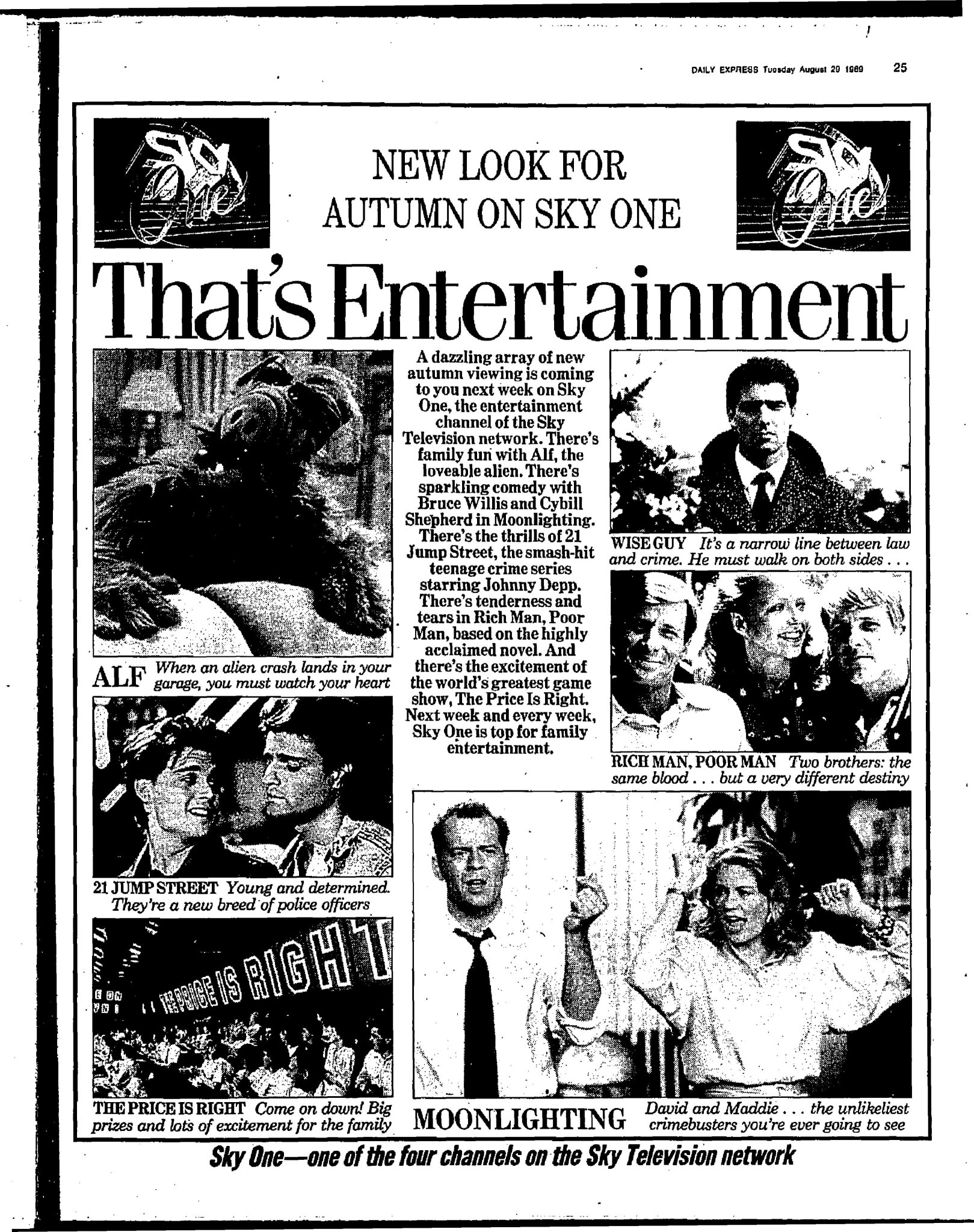 On 31 July 1989, the channel was renamed Sky One and closed in most European countries, broadcasting only to the United Kingdom and Ireland. During September of that year, Sky One began to air more recent programming as an early success being Moonlighting (which the BBC had previously screened but not repeated), ALF and Wiseguy, also aired the British television premiere of a new drama series 21 Jump Street. Back-to-back soaps (Rich Man, Poor Man and Falcon Crest) as well as action shows (Riptide and Hunter) were also added to its prime time schedule.[14] A number of Australian dramas (Against the Wind, Boney, A Town Like Alice and Barrier Reef), as well as the soap operas (Return to Eden, Chances, E Street and Paradise Beach) were aired. Some Australian children's programmes, such as Skippy the Bush Kangaroo and Zoo Family also aired on Sky One. In 1990 and early 1991 (prior to the launch of Sky Sports), Sky One broadcast numerous live cricket telecasts during which it pre-empted its regularly scheduled programming.