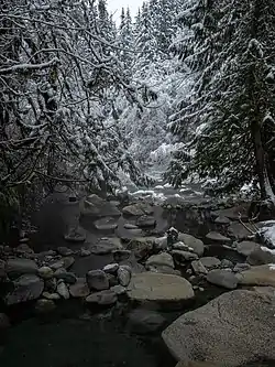 The hot spring emerges at a temperature of 64 °C.[3] A small waterfall of very hot water flows out of the steep vertical bank of Sloquet Creek and flows into two small soaking pools. Downstream is the larger, shallow soaking-pool similar to a typical creek bed but hot. The waters of the upper two pools and the waterfall may be too hot for bathing.[4] Supernatant liquid is a layer of cool water that floats on top of the denser, hot, mineral-rich hot springs outflow. The water should be tested the for temperature by dipping a container into the water before entering the water. Another large soaking pool located further down the creek bed is a more comfortable soaking temperature. An adjacent glacier-fed river provides opportunities for Roman or Turkish style bathing, of alternating hot and cold dips. Camping is available at the site, but there are limited services.[1]