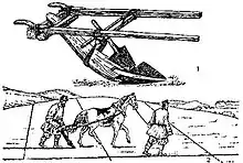In Russia, Finland, and a few nearby countries, a sokha (Russian: соха; Lithuanian: žagrė) is a light wooden ard, consisting of two body ards, with their parallel beams forming the two shafts for a single horse-drawn tillage implement with two socket shares (рассоха).[1] In later types the double body is combined into one wooden board. Chronicles and other literary sources show that the sokha was in use in Russia at least since the 13th century. It originated from northern Russia, e.g., around Novgorod.[2][3]