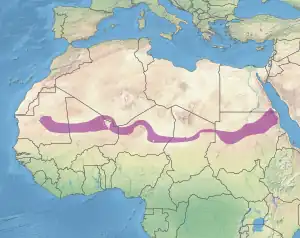 The ecoregion covers 1,101,700 square kilometers (425,400 sq mi) in Algeria, Chad, Mali, Mauritania, Niger, and Sudan. It extends east and west across the continent in a band, forming a transition between the hyper-arid Sahara Desert to the north and the Sahel grasslands and savannas to the south.[3] [2] [1]