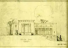 The Sphinx Tomb, constructed in 1903 on East Wheelock Street, was designed by Manchester architect William M. Butterfield and reflects the Egyptian Revival architectural style popular during the mid-nineteenth century.[4] In 1923, a significant addition was planned for the tomb; however, the proposed addition was never constructed. Instead, a smaller rear addition was constructed in 1926. The interior of the Sphinx was replaced after a fire started in the building's furnace destroyed it in 1929. The building was listed on the National Register of Historic Places in 2005.[5]
