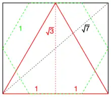 The minimal enclosing rectangle of an equilateral triangle of edge length 2 has a diagonal of the square root of 7.[14]