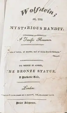 - ↑ Wolfstein, the Murderer; Or, The Secrets of a Robber's Cave: A Terrific Romance. To which is Added, The Two Serpents, an Oriental Apologue.
