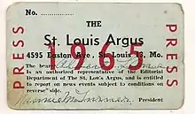 One primary goal of the St. Louis Argus was to organize the Negro community for political action. The editors of the St. Louis Argus promised its readers that it would be moderate, fair, and fearless in its journalistic efforts.[3] The newspaper championed better schools, educational opportunities, and full civil rights for blacks.[4] U.S. Grant Tayes served as a columnist for the newspaper in the 1930s, with the column Oh, Tempore!.[5]