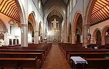After the death of de Franous, parishioners proposed a comprehensive scheme to build a church, a convent, schools, almshouses and a cemetery that would in some ways resemble the medieval conception of parish life. These were mostly built between 1845 and 1855, though the foundation stone of the present church was not laid until 1877. Designed by John Francis Bentley (1839–1902), the church was opened and blessed by Cardinal Manning in May 1879.[2]