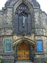 The main entrance on Carver Street with the War Memorial plaque to the left and Crucifixion statue above.
