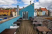 St Monans Church dates from 1369[7] and is situated in an isolated position to the west of the village on the very edge of the sea. It is perched on a low rock, over a small valley with a burn. As seen from most directions it has the sea as a backdrop. The original graveyard surrounds the church and a more modern cemetery stands further westwards on the upper slopes of the little hill. This contains the local war memorial.[8] Standing at the extreme west end of this the ruin of an earlier church can be viewed across fields, again perched on the sea edge.