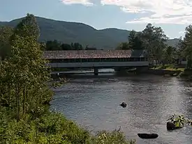 The Stark Covered Bridge is a historic wooden covered bridge over the Upper Ammonoosuc River in Stark, New Hampshire. It carries a connecting roadway which joins the Northside Road to New Hampshire Route 110. The bridge was built in either 1857 or 1862 (sources differing), replacing a floating bridge that had been located a short way upstream. It is a two-span Paddleford truss bridge, which is a regional variant of the Long truss. It is 151 feet (46 m) long with a span of 138 feet (42 m), and is 29 feet (8.8 m) wide, carrying an 18-foot (5.5 m) wide roadway and two 6.5-foot (2.0 m) sidewalks. The shore ends of the bridge rest on abutments of granite stone, while the center of the bridge is supported by a reinforced concrete pier, which is flared on the upstream side to deflect debris. The bridge is reinforced with steel beams, giving it a carrying capacity of 15 tons.[2] It is decorated with pendant acorn finials and painted bright white.