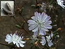 Stephanomeria diegensis is a species of flowering plant in the family Asteraceae known by the common name San Diego wirelettuce.[2] It is native to the coastal hills and ranges of southern California and Baja California, where it grows in many types of open habitat. It evolved as a hybrid of Stephanomeria exigua and S. virgata.[3] Furthermore, it is thought to be the result of homoploid hybrid speciation, which is uncommon.[4] The plant is frequently misidentified as one of its parents, especially if older taxonomic keys are used.[5] This is an erect annual herb easily exceeding two meters in height. Its slender stem has many spreading branches. The basal leaves are linear to lance-shaped and up to 10 centimeters long. The leaves wither early and are absent for most of the year, giving the plant a twiglike appearance. Leaves on the upper stem are small and reduced. The inflorescences are usually clusters of flower heads located at intervals on the stiff branches. Each head has a cylindrical base lined with phyllaries. These are often glandular. The head contains several ray florets, each with an elongated tube and a white or pink-tinged ligule measuring around a centimeter long. The fruit is a grooved achene tipped with a spreading cluster of long, plumelike pappus bristles.