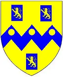 - Sir Henry Rolle (1545–1625), eldest son, married firstly Elizabeth Watts, daughter and heiress of Roger Watts of Somerset, secondly a Fortescue, daughter of John Fortescue (1525–1595) of Fallapit,[13] East Allington by his wife Honor Speccot (died 1606),[14] whose monumental brasses exist in East Allington Church.[15] His Exeter townhouse was the "Abbot's Lodge" (destroyed in 1942 during World War II bombing), in Cathedral Close within the precincts of Exeter Cathedral. He made alterations to that house and added decorative heraldic plaster escutcheons dated 1602, one of which showed Rolle impaling Watts, of six quarters (1st & 6th Watts: Argent, on a fesse vert between three eagle's heads erased sable as many crosses sarcelly of the first, the arms of Sir John Watts (died 1616), Lord Mayor of London in 1606)[16] the other Rolle impaling Fortescue.[17] The house had been the townhouse of the Abbot of Buckfast Abbey, which Abbey and much of its lands, including the Abbot's Lodge, had been acquired in 1545 by the patriarch George Rolle (d.1552) following the Dissolution of the Monasteries.[18] It had been used by George Rolle as his townhouse, by the name of "Buckfast Place" and was the place of his death in 1552. In 1609 he purchased from William Howard, 3rd Baron Howard of Effingham (1577–1615) several of the larger former holdings of Barnstaple Priory in Pilton and Bradiford, whose family had held the lands since the Dissolution of the Monasteries.[19]