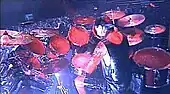 The stage blood caused technical difficulties as it soaked the microphone, guitars, and cymbals, which according to Shirley sounded like "coffee mugs being tapped with a spoon".[14] A review of the DVD observed that "If it wasn't for guitarist Jeff Hanneman being out of position and missing all of the blood, the guitar might have sounded pretty bad."[10] Hanneman missed the initial downpour due to a technical problem with his guitar, and was deluged by a light shower when coming back on-stage.[15] Shirley replaced thousands of cymbal and drum hits with those used on previous recordings; the process took several days to complete.[14] After recording the DVD, the band used a sprinkler system with diluted water rather than a bucket with blood that was like tar when recording the DVD. King later remarked, "My guitar didn’t like it, that was the last time I played it,"[16] and he donated it to the Hard Rock Cafe after the show.[16] Vocalist Tom Araya felt the same and admitted; "It was messy. I couldn't play because the initial dump at the beginning of the song got all over me. I couldn't hold my pick. I was slapping my bass trying to get sound out of it."[17]