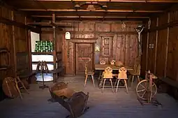 It is a room heated by a large stone or tile-covered stove and entirely lined with wood to keep the heat inside; the woods mostly used for the wall panels are chestnut, walnut, spruce, and Swiss pine. The logs are inserted into the stove through a small door that opens on an adjacent room, usually the kitchen or the corridor.