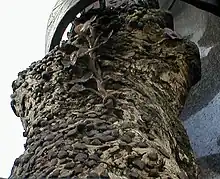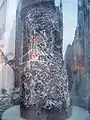 The trunk section is 2.19 m (7 feet 2 inches) tall and is held in place by five iron bands; the iron bears the date 1575[1] and the initials HB, presumably for Hans Buettinger, the house owner who had the iron replaced. The tree was a forked spruce which started to grow around 1400 and was felled in approximately 1440,[2] as was revealed by examination in 1975.[3] There was regrowth in the middle of the trunk after blows from an axe. The first nails were inserted while the tree was still alive (thus before 1440).[2] The first written mention of it dates to 1533;[2][4] in 1548, it was already located on the wall of a house in what became Stock-im-Eisen-Platz.
